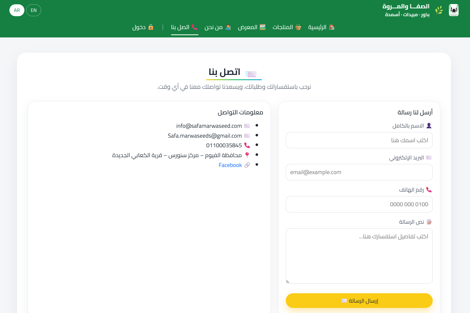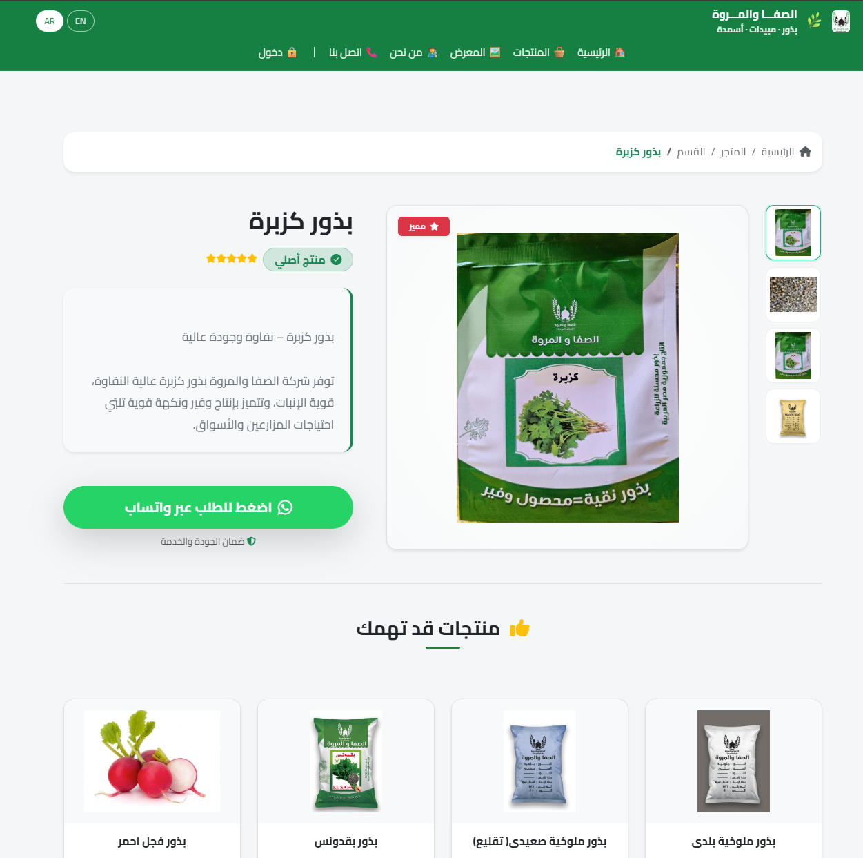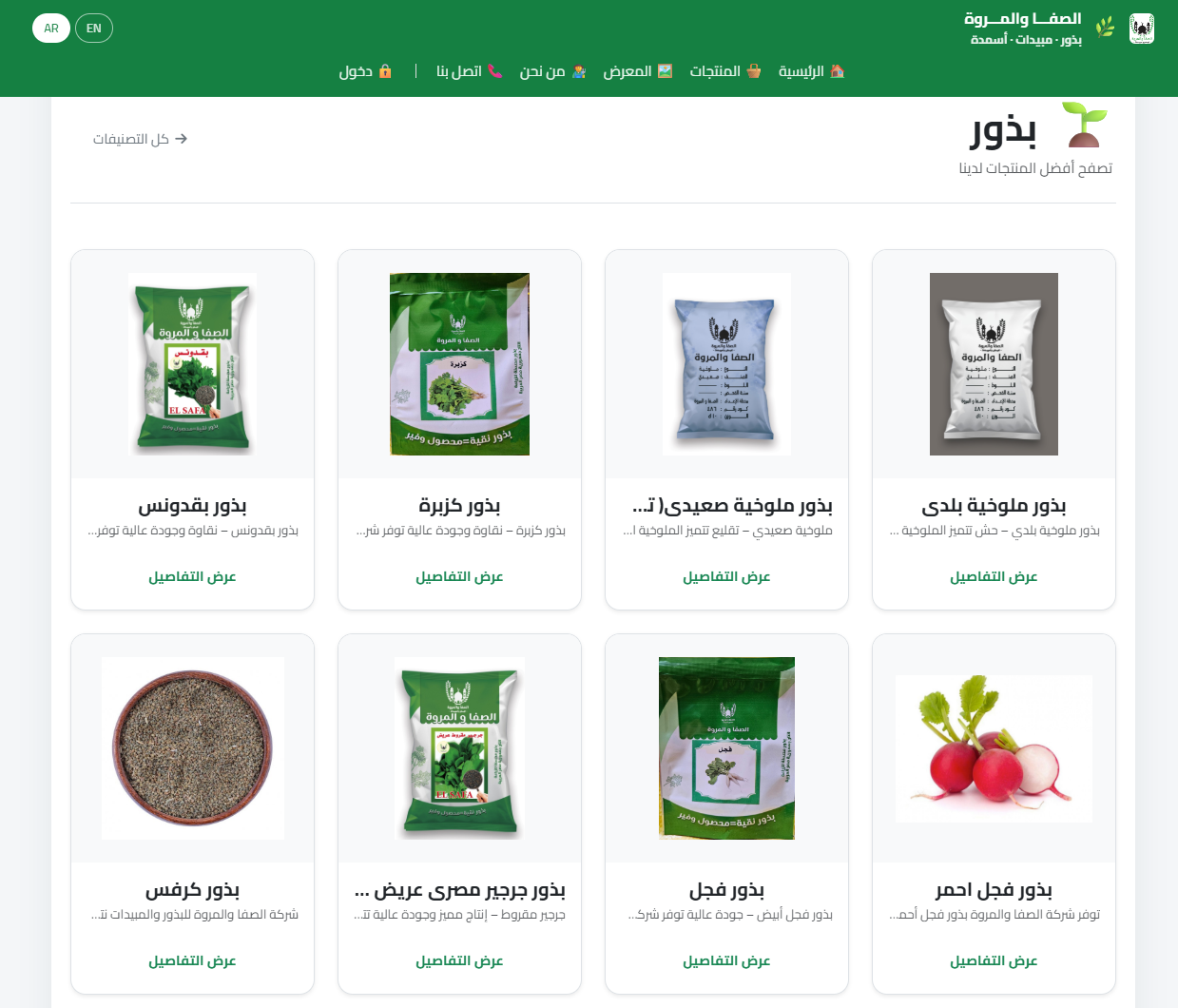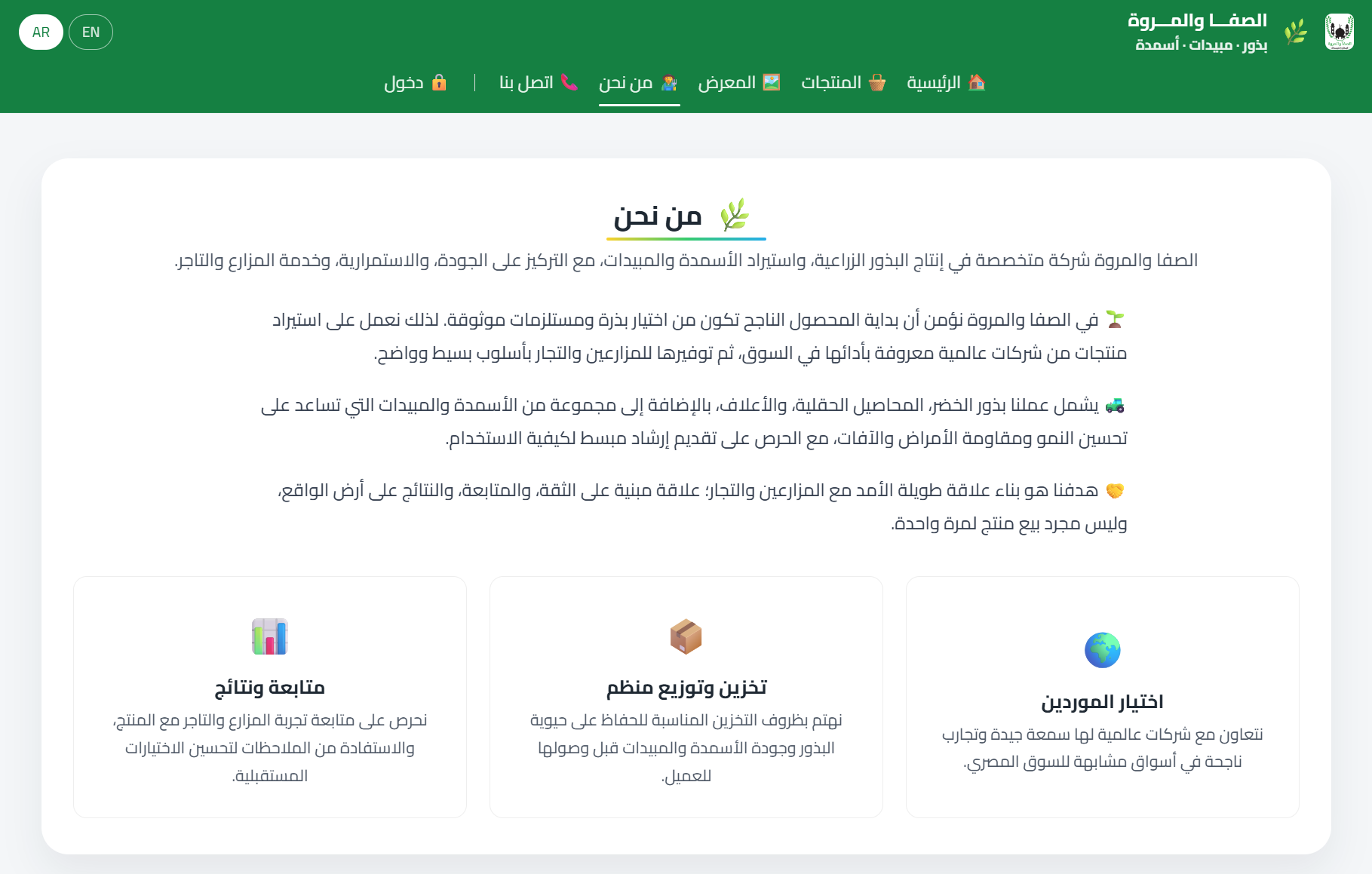 نبذة عن المشروع: شركة "الصفا والمروة" هي كيان رائد في مجال استيراد وتوزيع البذور والأسمدة والمبيدات في السوق المصري. كان الهدف من المشروع هو بناء تواجد رقمي قوي يعرض منتجات الشركة والوكالات العالمية التي تمثلها، ويسهل التواصل مع شبكة العملاء من مزارعين وتجار.